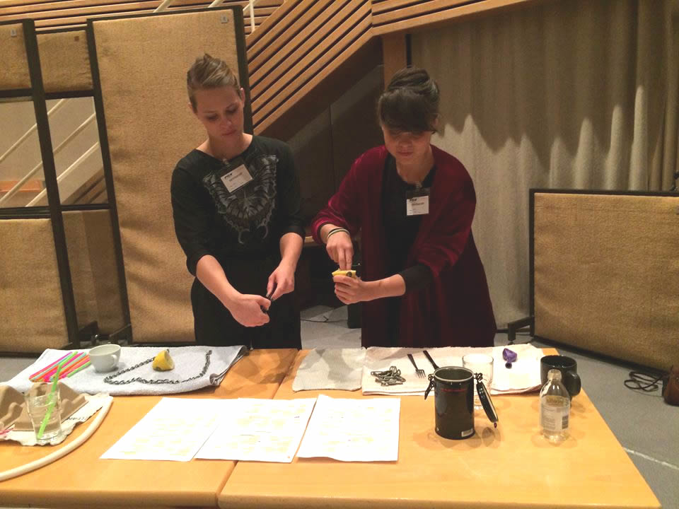 Inspired by John Cages Lecture on Nothing Inga and Rósa use objects to create sounds to accompany the words and content of the lecture. They suggest situations and paint pictures with the sounds of the objects in the manner of foley artists.